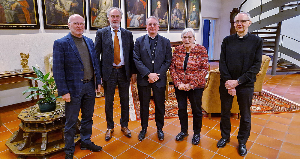 Op de foto van l naar r: scriba Simon Middelkamp, classispredikant Marco Luijk, Mgr. Ron van den Hout, mw. Elly de Haan uit Maastricht en dr. Bernhard Hegge.